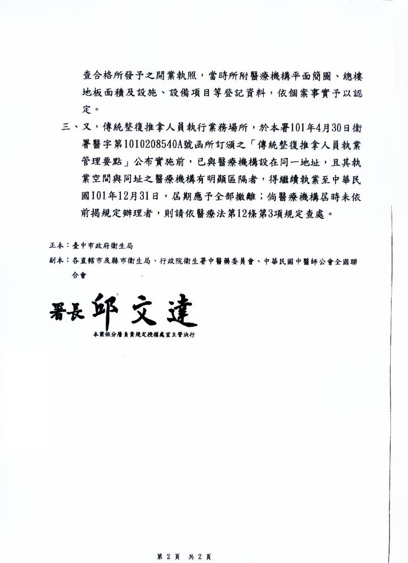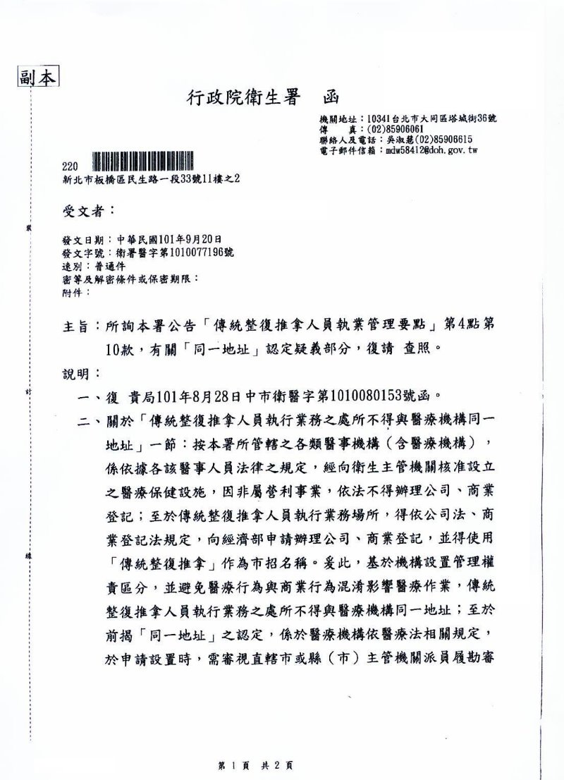 「傳統整復推拿人員執業管理要點」有關「同一地址」由衛生局認定疑義部份之補充說明
