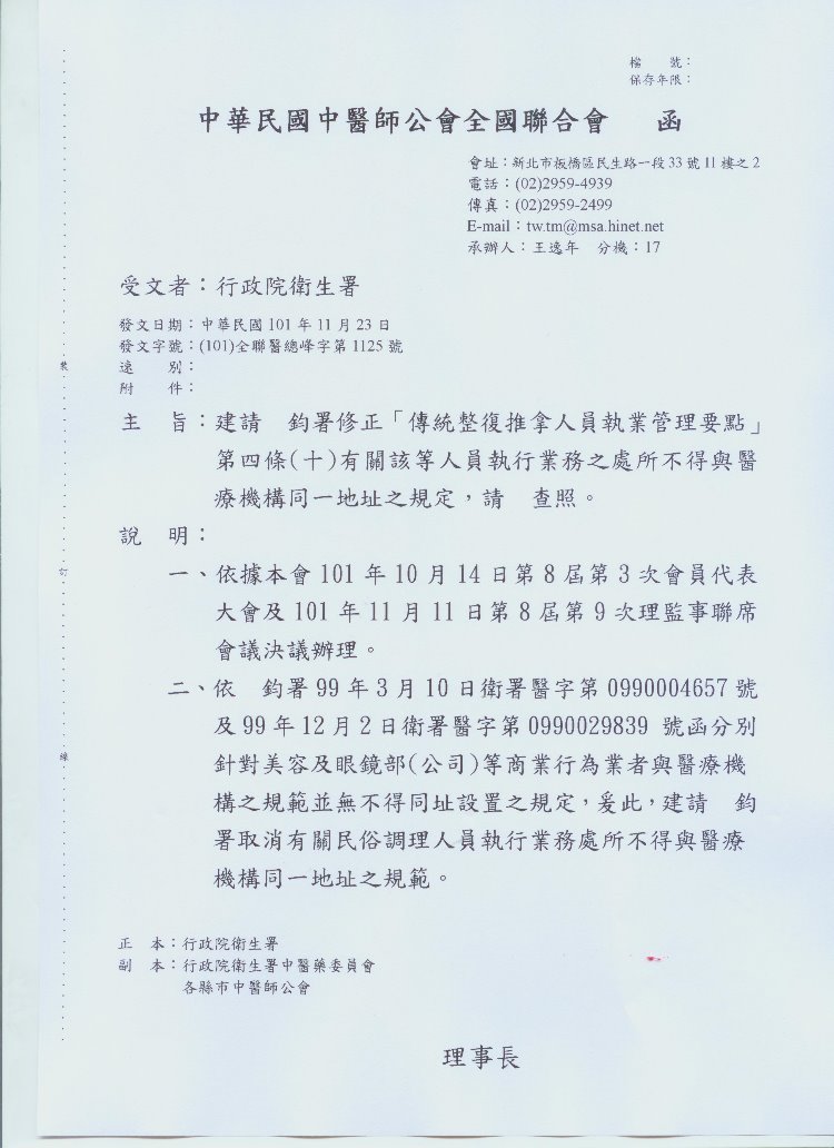 中醫診所與傳統整復推拿得在同一地址分別設立之共識,已在本會及中醫師全聯會爭取下,衛生署醫事處主管及立法委員間形成。