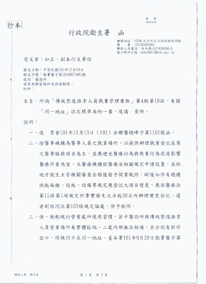 詳如下列附件行政院衛生署 101 年 12 月 24 日衛署醫字第 1010027485 函