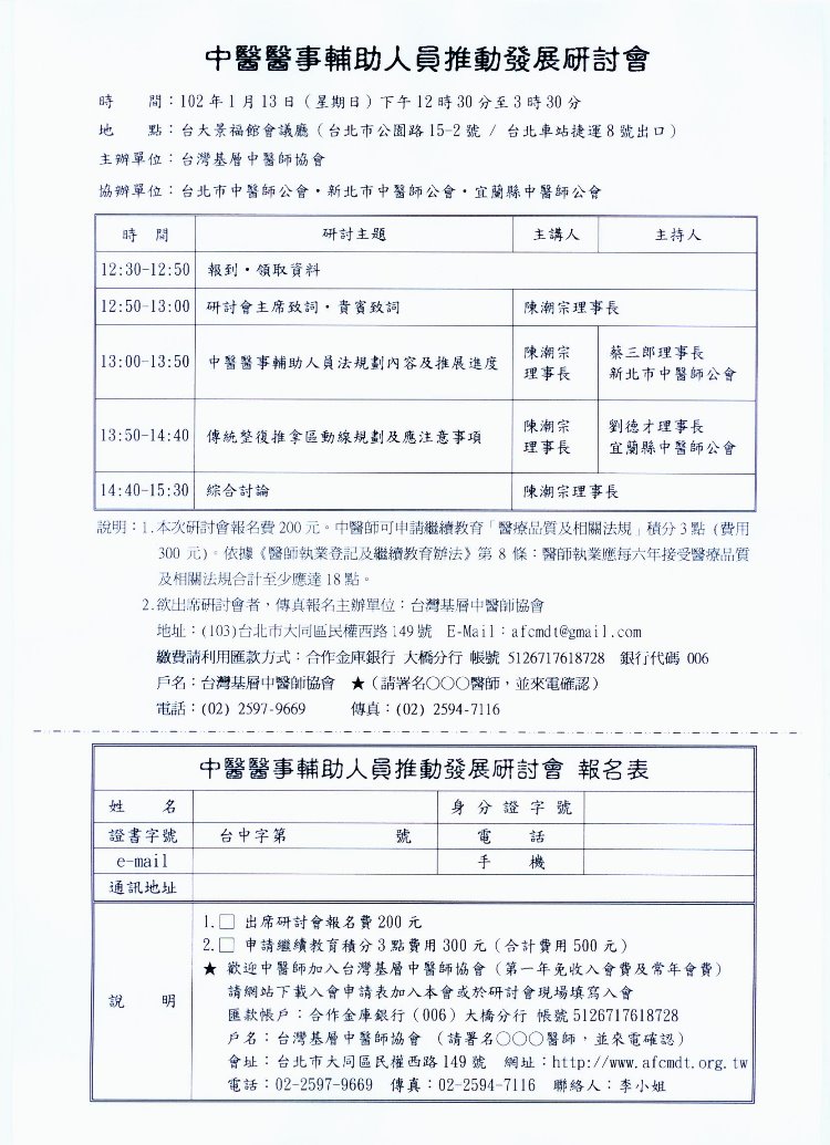 台灣基層中醫師協會 會址 : 台北市民權西路149號4樓 電話 : (02)2597-9669 傳真 : (02)2594-7116